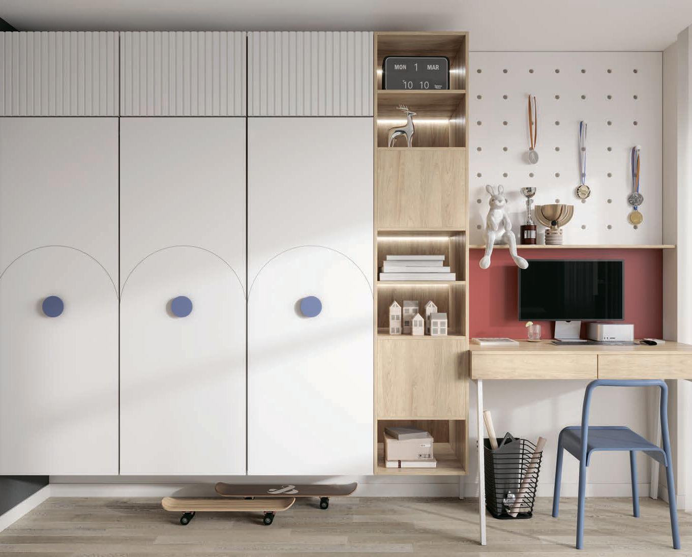 Мебель для детской «Беатриче» сочетает в себе элегантный дизайн и функциональное наполнение. Позволит обеспечить детскую всем необходимым функционалом, не загромождая при этом пространство для игр. Такая комната станет идеальным местом для занятий и веселого времяпрепровождения. Фасады дополнены ультрамодной фрезеровкой. Удобный функционал обеспечен австрийской фурнитурой BLUM, что поможет уберечь ребенка от травм. Внутреннее оснащение адаптировано для хранения школьных принадлежностей, одежды, игрушек и спортивного инвентаря. Письменный стол оснащён выдвижными ящиками для аккуратного хранения канцелярских принадлежностей. Яркий дизайн обеспечит позитивный настрой. Внутреннее наполнение — комфорт и безопасность использования.