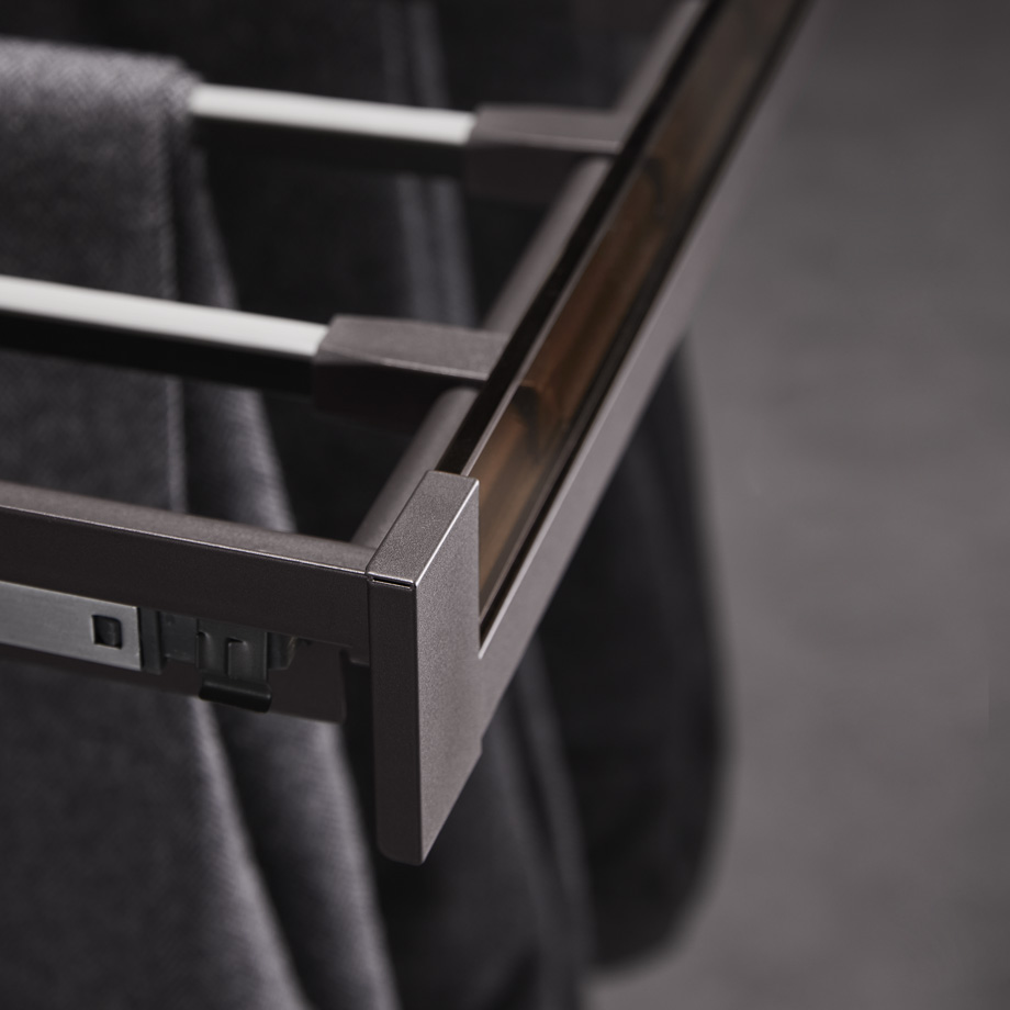 Полное выдвижение обеспечивает легкий доступ ко всем хранимым вещам, оптимизируя пространство гардероба.