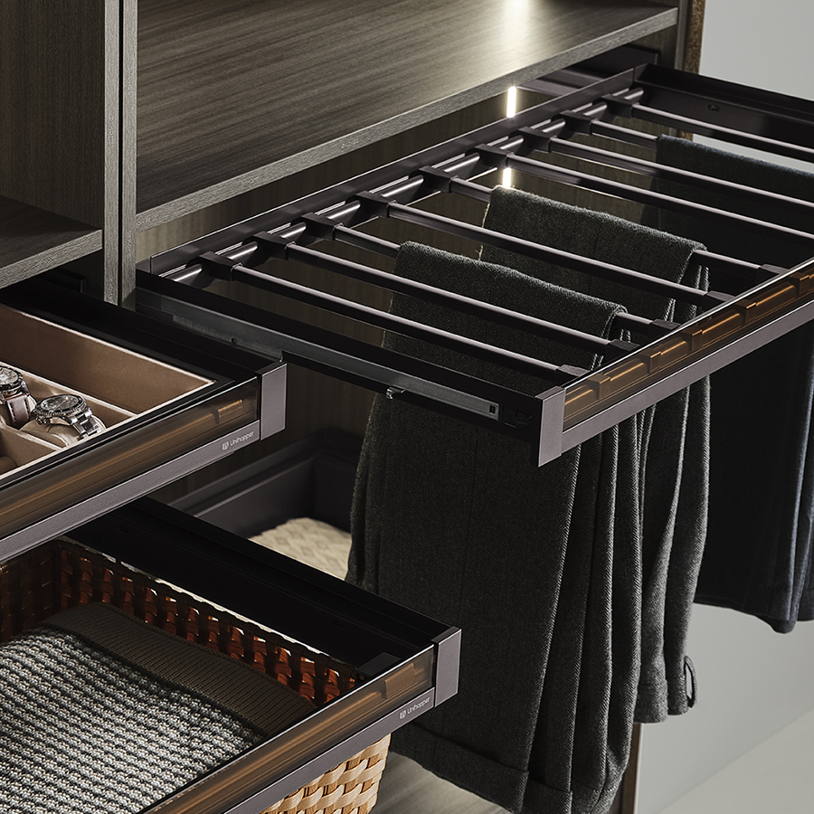 Выдвижная полка для брюк Unihopper — это идеальное решение для делового гардероба, сочетающее строгий и лаконичный дизайн с функциональностью. Эта полка обеспечивает удобство и надежность в хранении брюк.