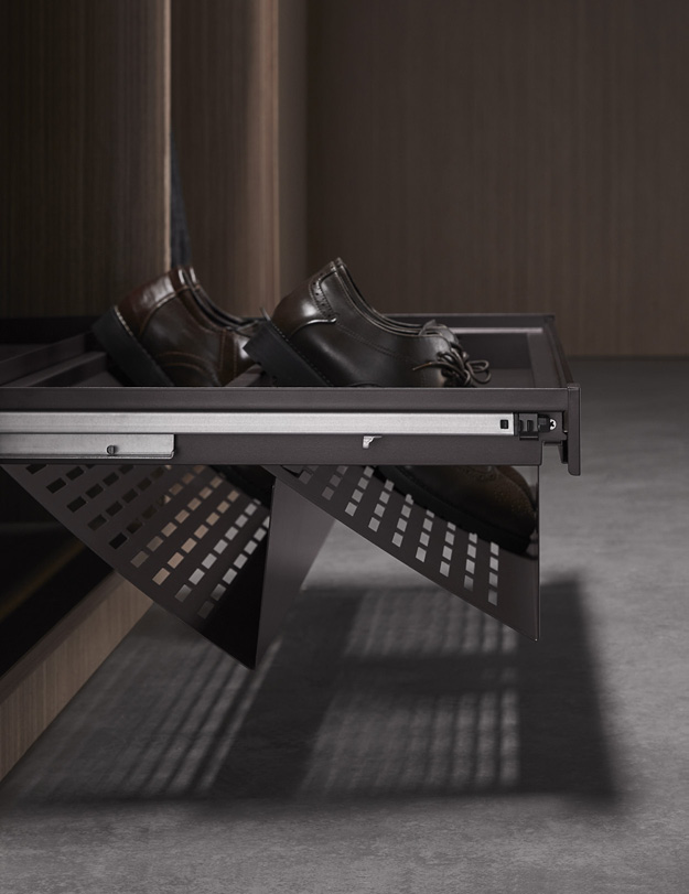 Полное выдвижение обеспечивает удобный доступ ко всей обуви, оптимизируя пространство гардероба.