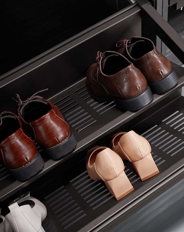 Полное выдвижение обеспечивает удобный доступ ко всей обуви, оптимизируя пространство гардероба.