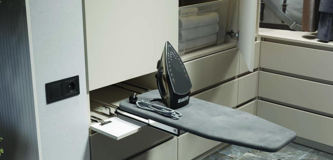 Особенность гардеробной «Дюссельдорф» - встроенная в шкаф гладильная доска решение, которое становится всё более популярным. Гладильная доска здесь - незаметная часть шкафа.