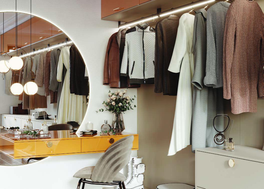Разрабатывая дизайн и все нюансы обустройства гардеробной, обязательно уделите особое внимание освещению, которого очень часто не хватает. Для таковых целей низко висящие лампы или люстры не подойдут, поскольку они будут все время мешать. Также позаботьтесь о зеркалах, ведь при их помощи можно визуально увеличить гардеробную. А при переодевании будет возможность посмотреть на свой образ. Помещение желательно красить в светлые нейтральные тона.