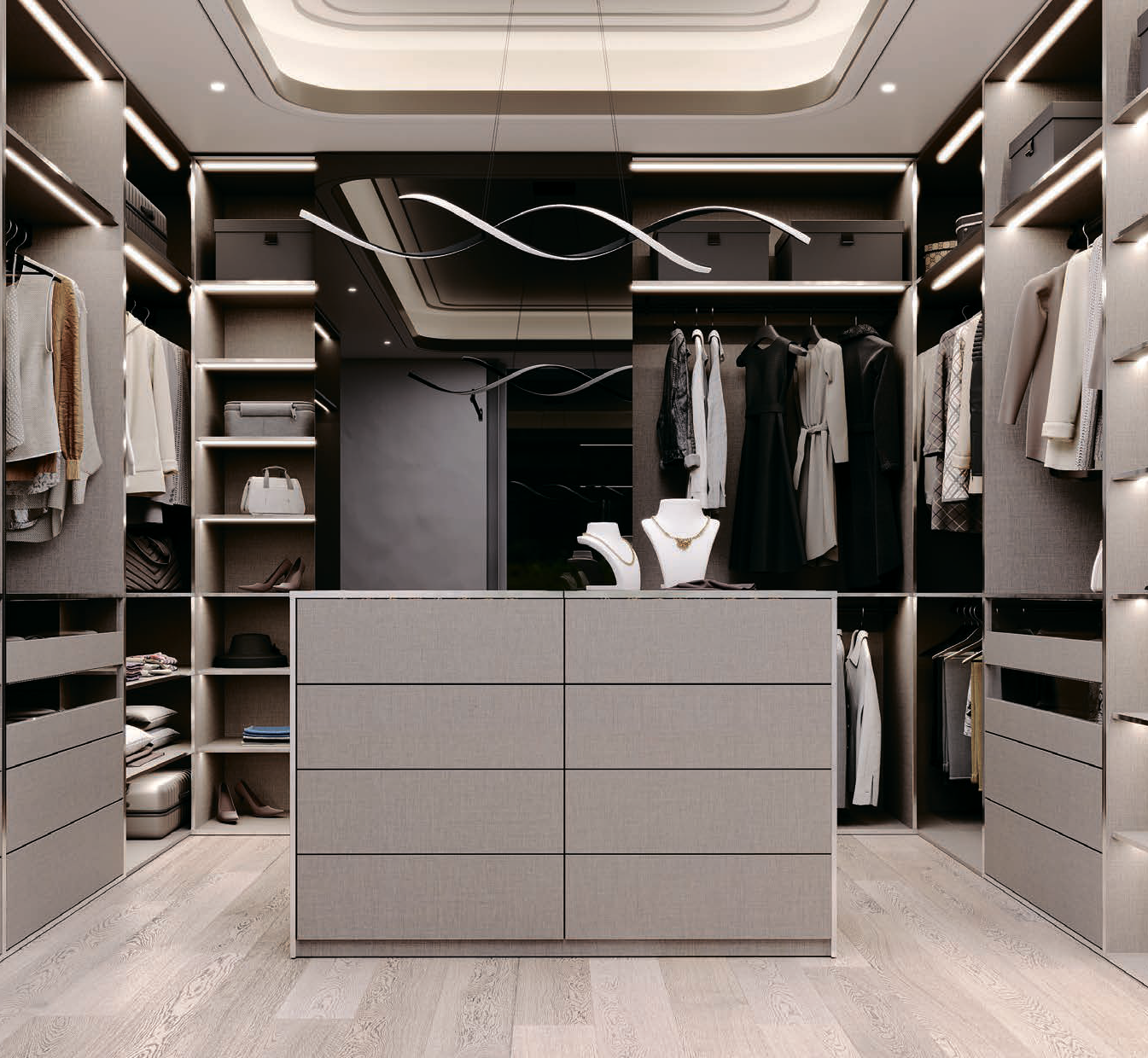 Мы советуем оборудовать гардеробную комнату по-максимуму, а именно использовать центральный остров, который представляет собой эргономичную систему хранения. Каждая деталь мебели для гардеробной должна быть продумана до мелочей, благодаря чему отведенное пространство будет использовано максимально эффективно.