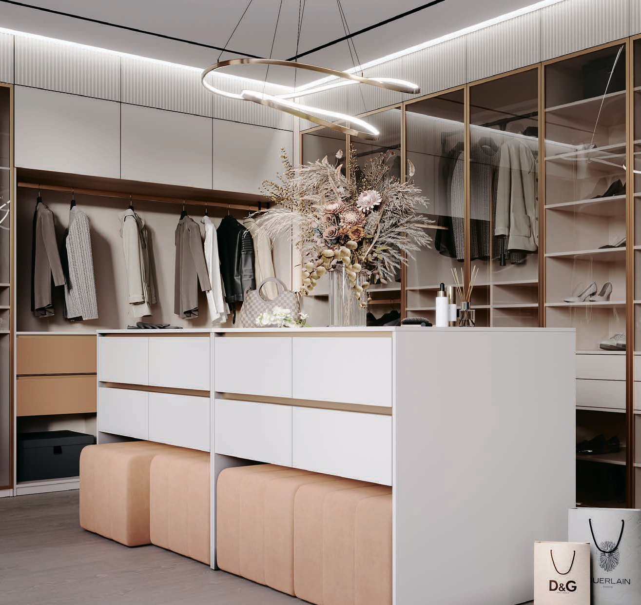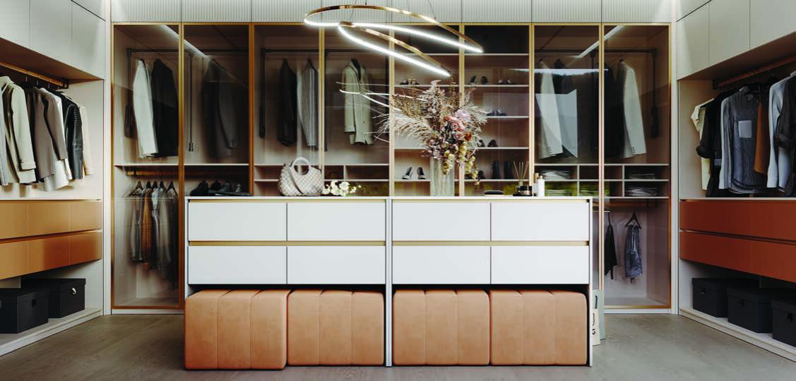 Гардеробная «Мишель» выполнена с прозрачными фасадами и акцентными ящиками с ручками-профиль Тимко.Гардеробная-витрина имеет сразу две функции: практическую и эстетическую. Первая состоит в возможности хранения вещей, тогда как вторая заключается в привлекательном, нестандартном внешнем виде.
