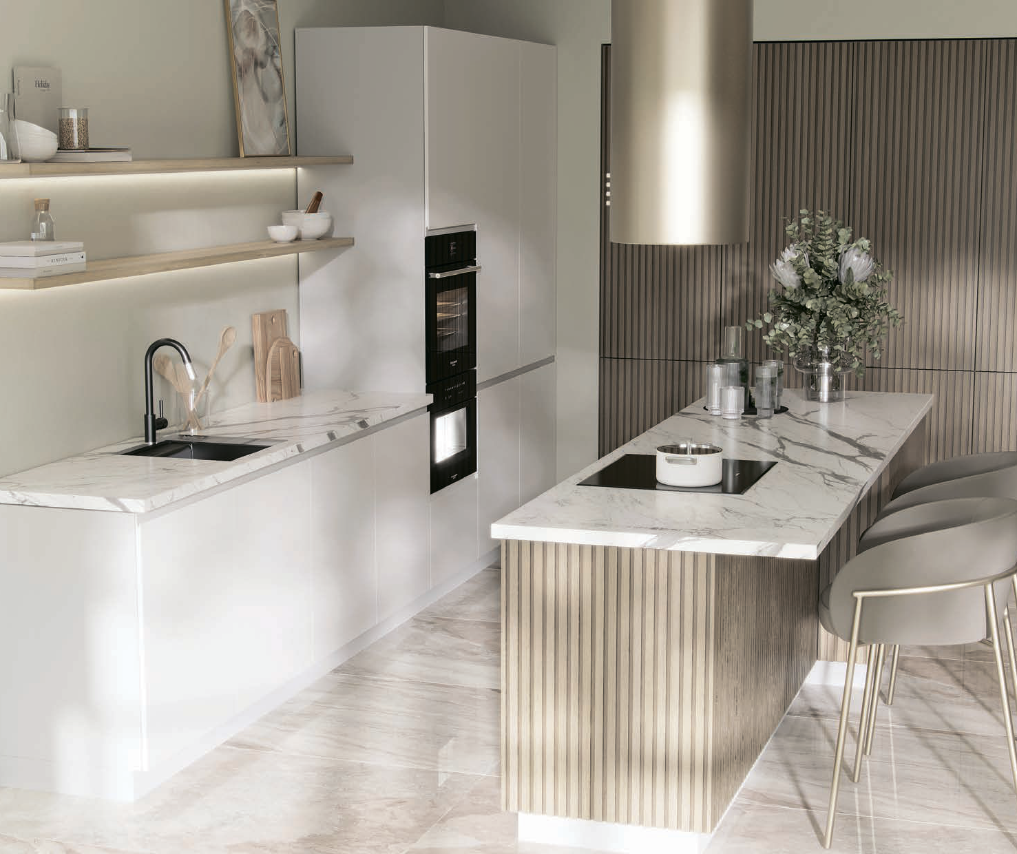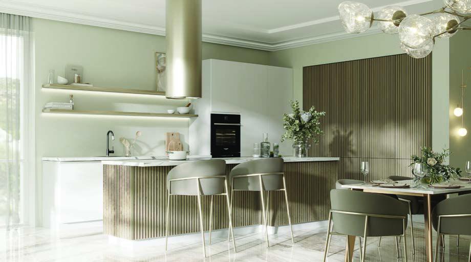 Стильный гарнитур «Лея» отличается интересной компоновкой модулей, цветовым решением и функциональным наполнением. Все это обеспечивает комфорт и удобство в сочетании с современным и элегантным внешним видом. Фасады гарнитура изготовлены из МДФ — ритмичные вертикальные структурированные поверхности. Легкая, современная, но невероятно атмосферная композиция, и каждая нота ее элементов раскрывается многогранно, стоит лишь углубиться в ее звучание. «Лея» — это мелодия геометрических линий, которая легко впишется в любой современный дизайн. Благодаря своим формам фрезеровка придает пространству необычный вид. Мелодия создается за счет игры света и тени. Отсутствие верхних шкафов является особым функциональным и дизайнерским элементом, который красиво дополняет образ кухни и делает его более легким. Благодаря этому мебель приобретает особый запоминающийся вид.