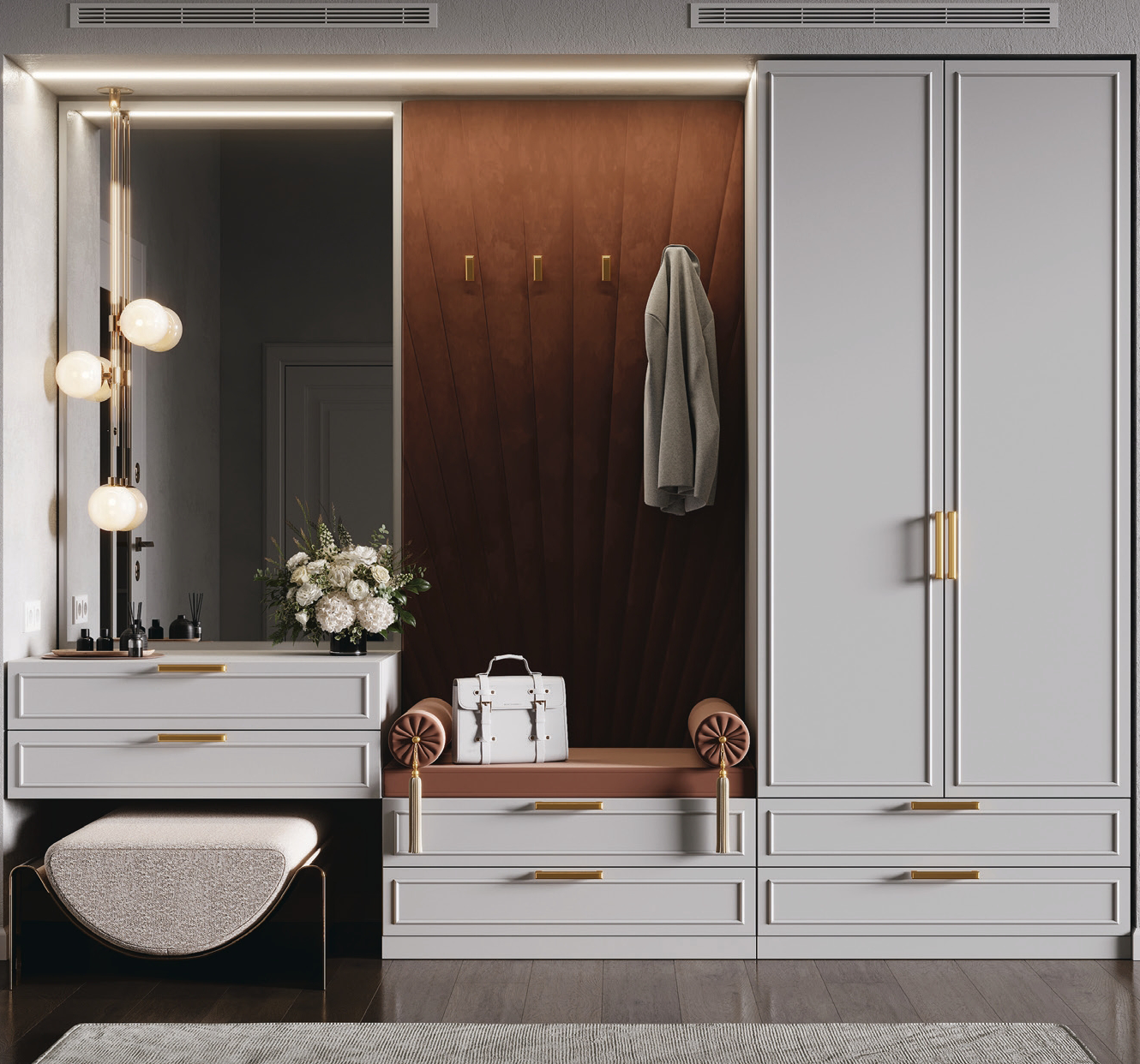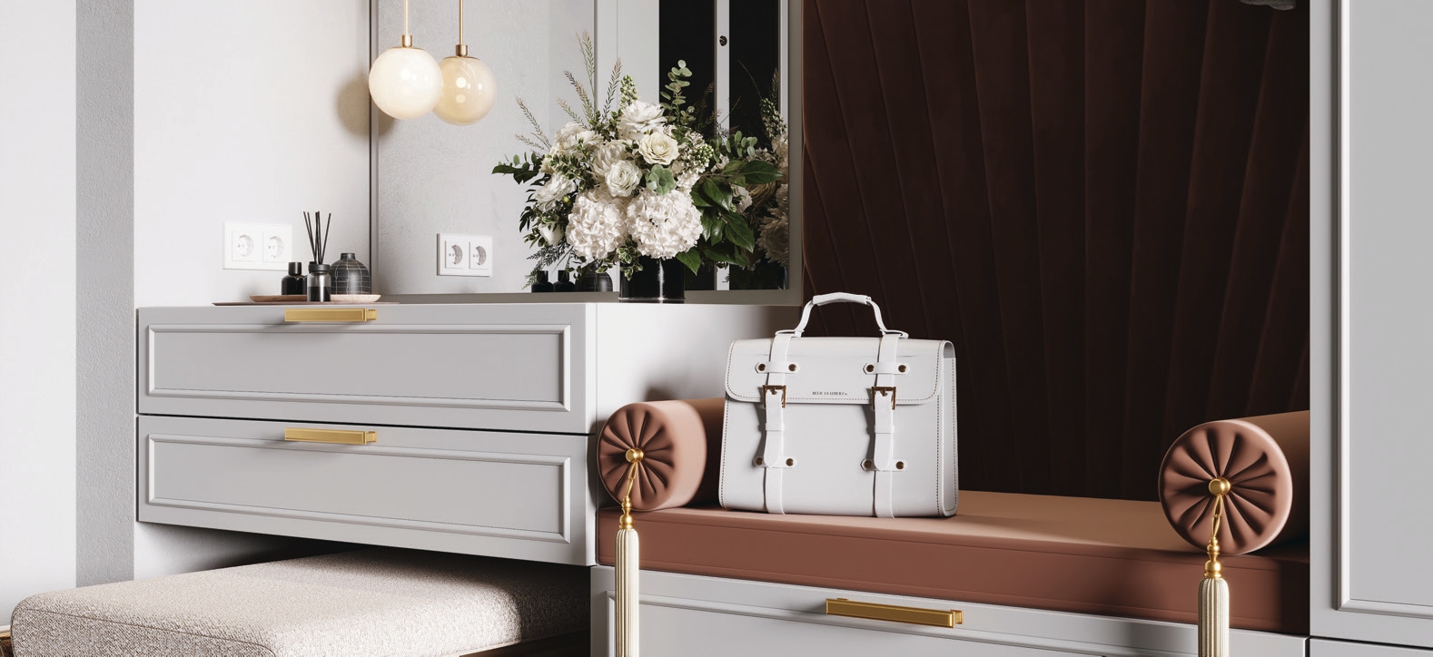 Прихожая «Сиэтл» создает ощущение чистоты и света в комнате, смотрится стильно и изящно - настоящее украшение Вашего дома. Сочетание белоснежных поверхностей, латунных элементов и зеркала создает неповторимую комбинацию! Роскошно, празднично, индивидуально! Эта прихожая станет центральным элементом комнаты. Мягкие панели в использовании приятны тактильно, в добавок, это круто смотрится. Зеркало и навесная тумба с двумя ящиками завершают ансамбль функциональности. Такая прихожая будет служить эксклюзивным украшением любого интерьера.