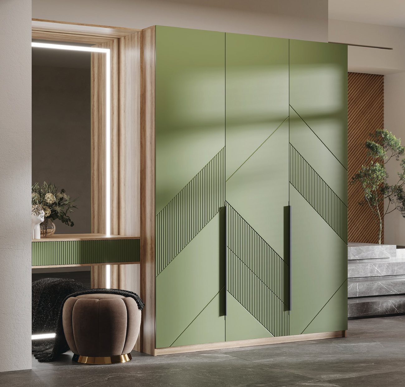 Сдержанный дизайн, строгая геометрия и спокойные тона. привнесут атмосферу релакса. Геометрический декор фасадов создан по уникальной технологии с помощью фрезера. Распашные створки дополнены акцентными профиль-ручками. Фурнитура и система хранения от австрийской фирмы BLUM. За фасадами спрятаны вместительные отделения для хранения любых элементов гардероба. Внутреннее наполнение адаптировано под гардероб всех членов семьи.