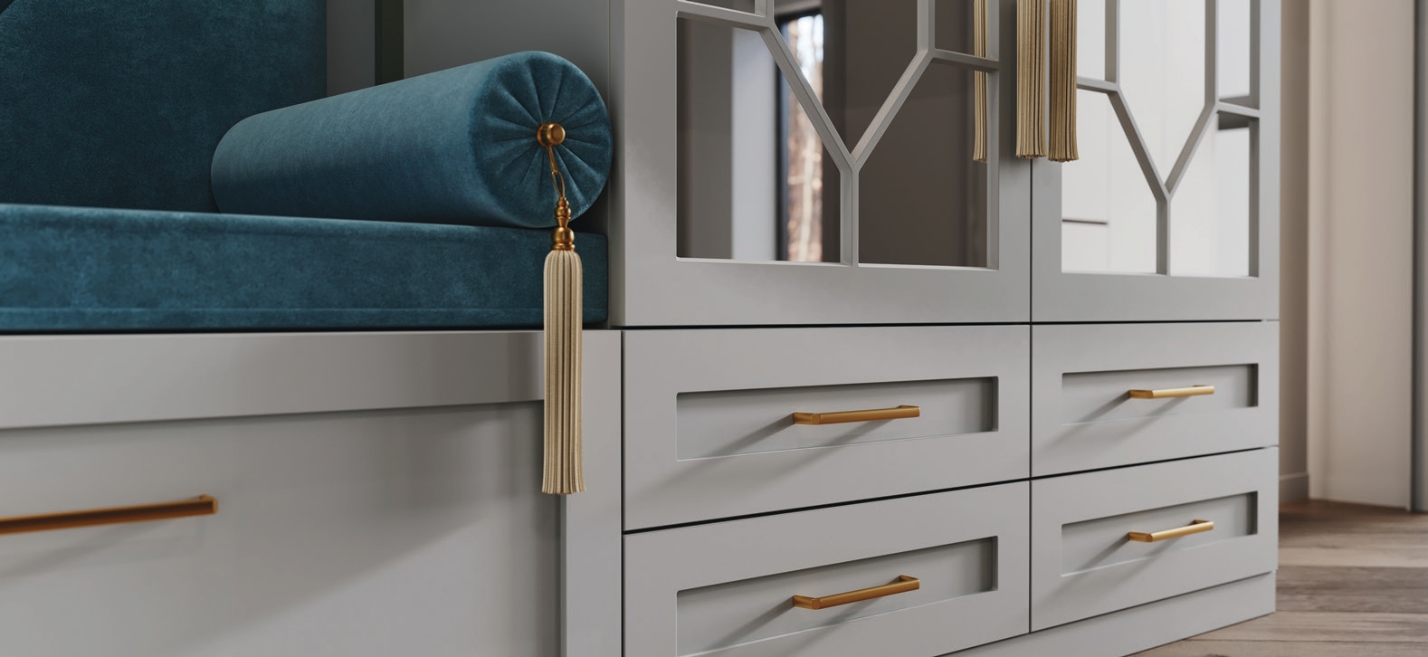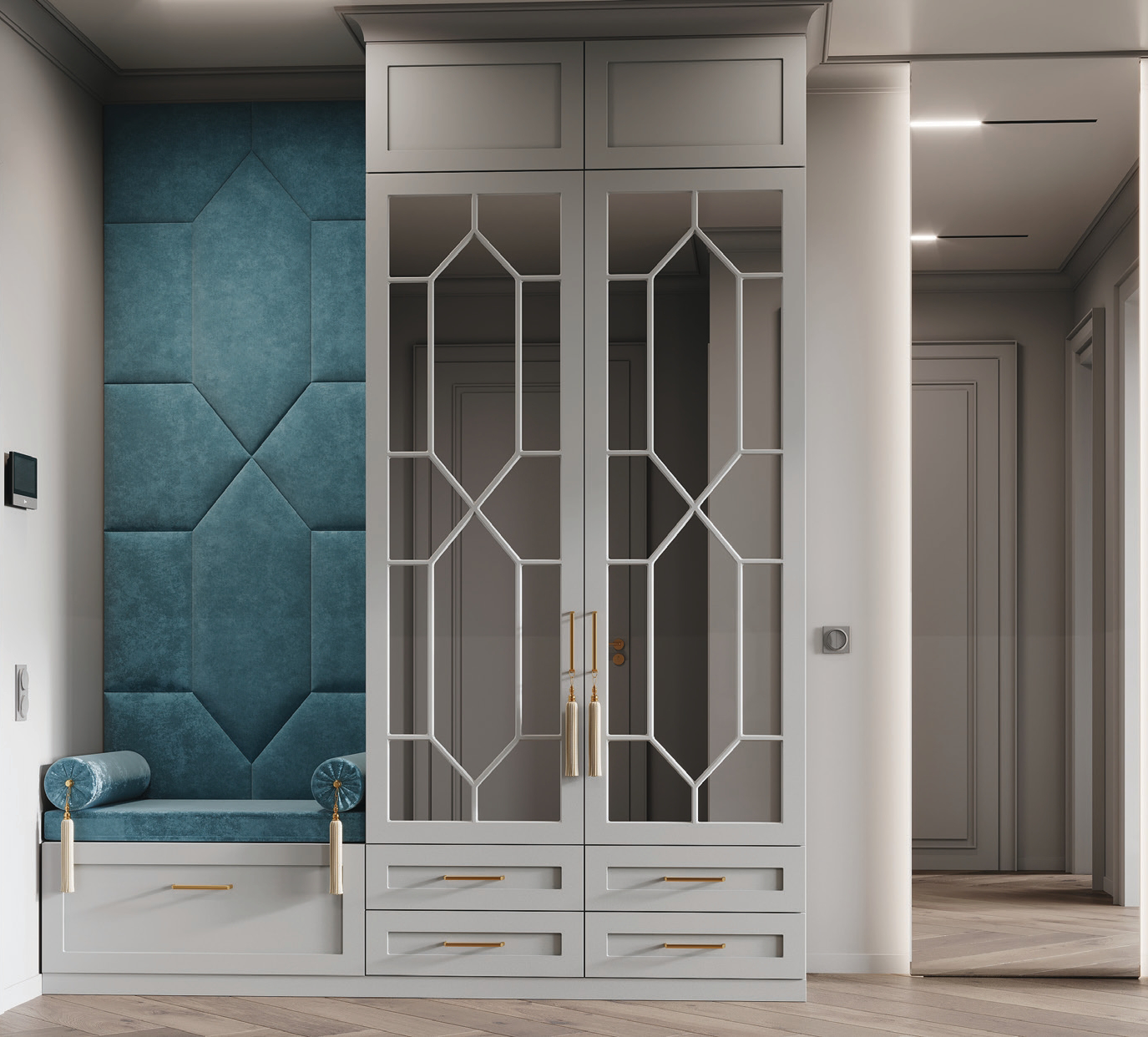 Прихожая «Демис» - уникальное сочетание красоты и функциональности. Оригинальные фасады с перекрестьями на фоне зеркал в сочетании с глухими секциями смотрятся невероятно стильно. Зеркальные элементы визуально увеличивают комнату, а светлые поверхности делают ее уютнее. Контраст фактур и оттенков обеспечен нишей с тканевым декором. Эксклюзивная фурнитура придает особый шарм.