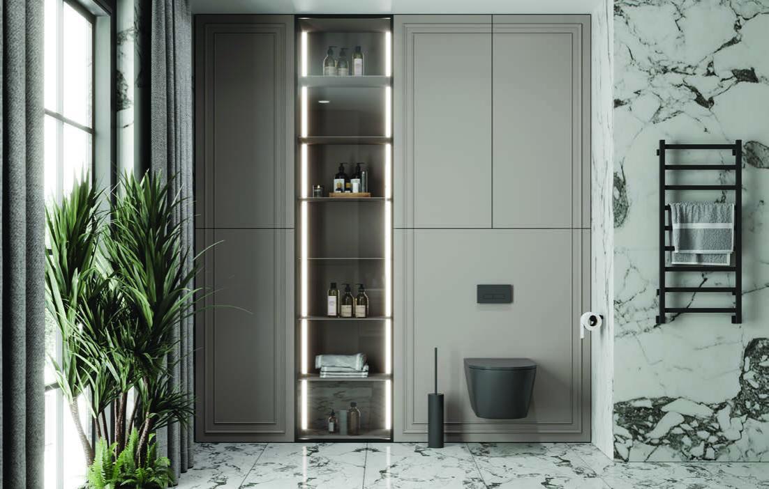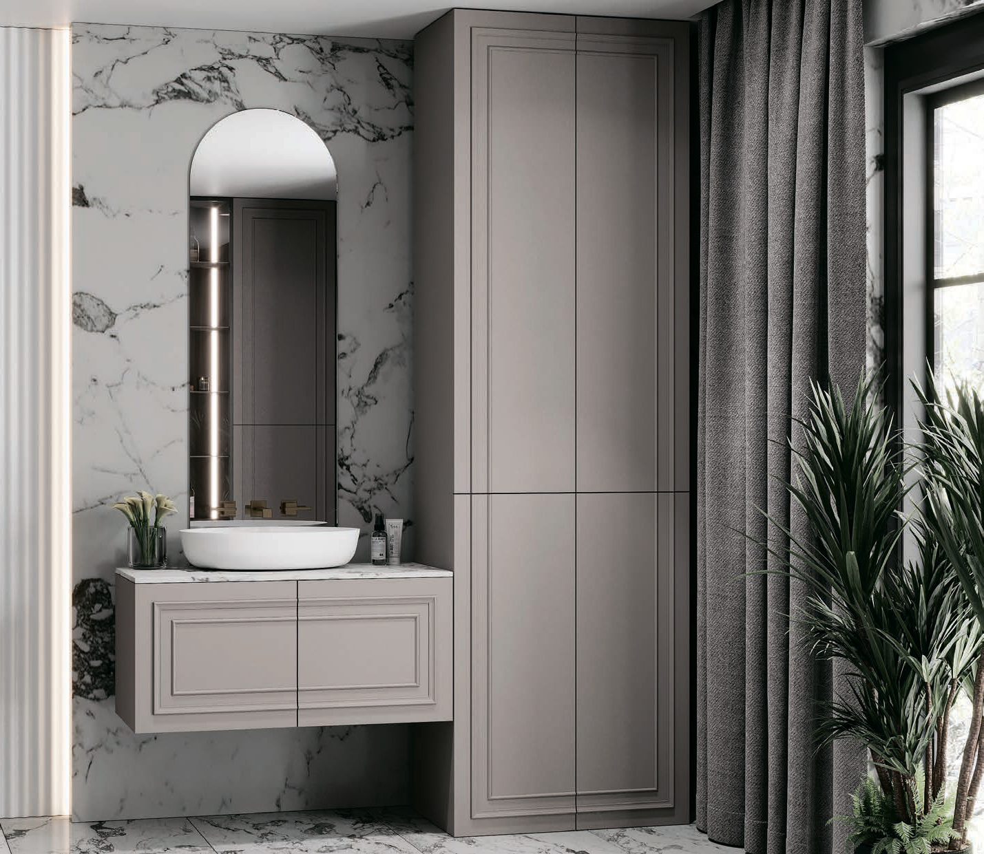 В мебели «Лоурен» прекрасно все! Роскошный, но лаконичный дизайн, матовые фасады, отсутствие фурнитуры, стеклянный пенал-витрина! Распашные и выдвижные системы оснащены высококачественной фурнитурой австрийской фирмы BLUM. За элегантными фасадами спрятаны вместительные отделения для хранения любых ванных принадлежностей. Такая мебель придаст элегантность и внесет элемент роскоши ванной комнате. Она придется по душе любителям классического стиля в интерьере