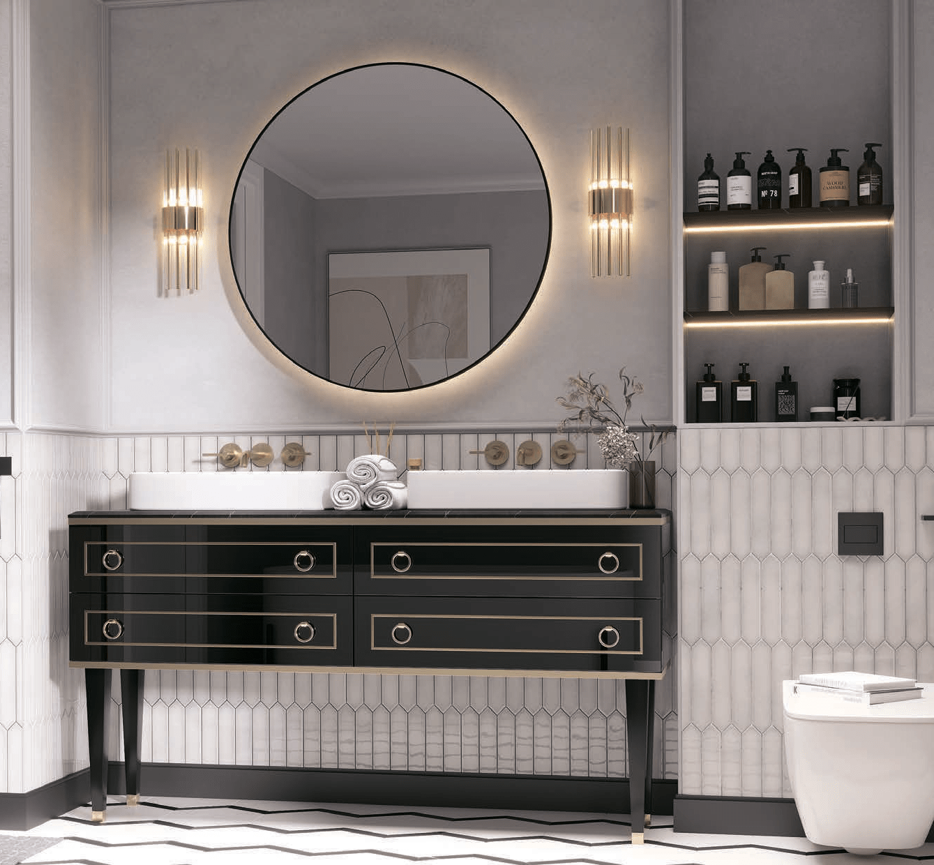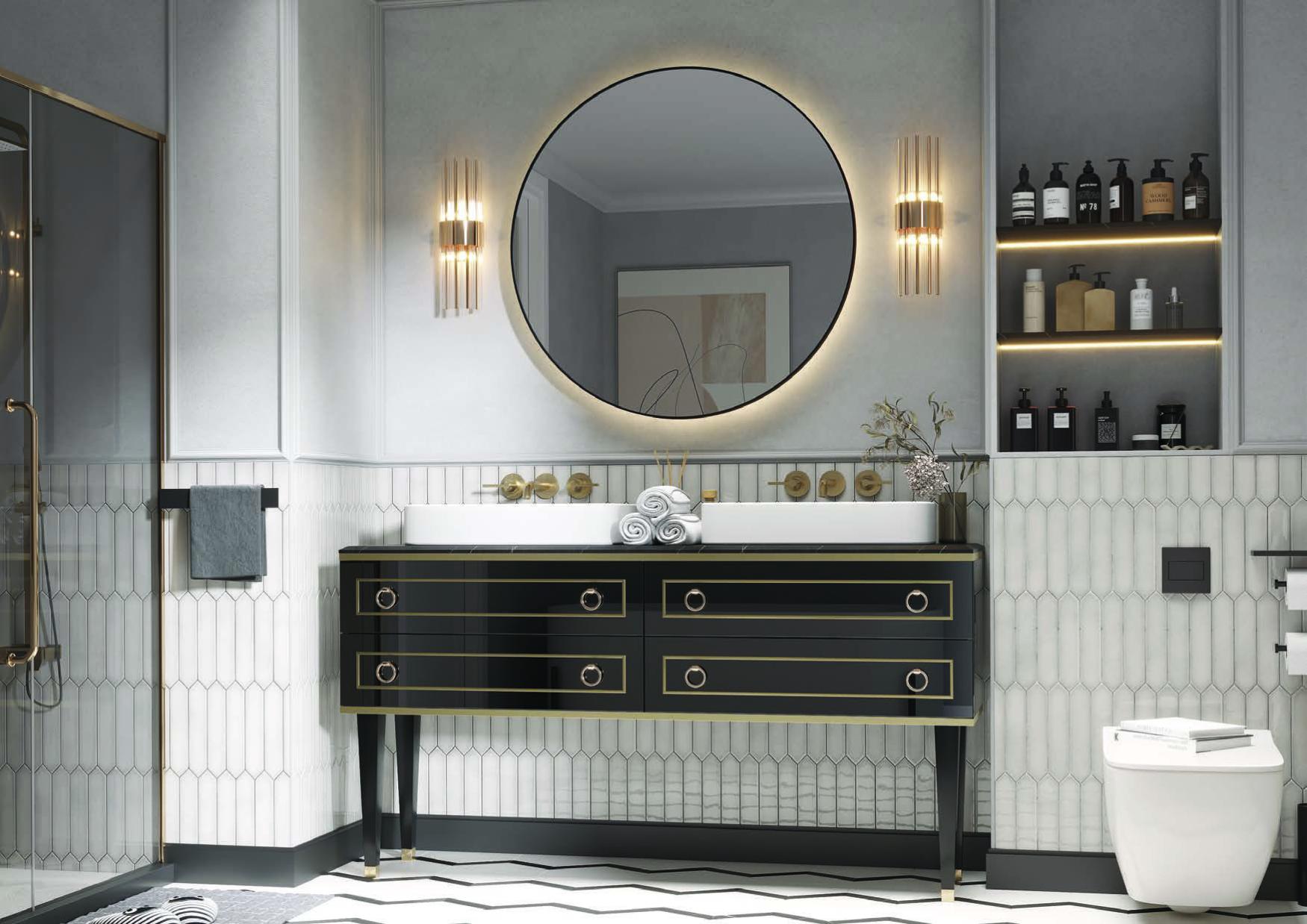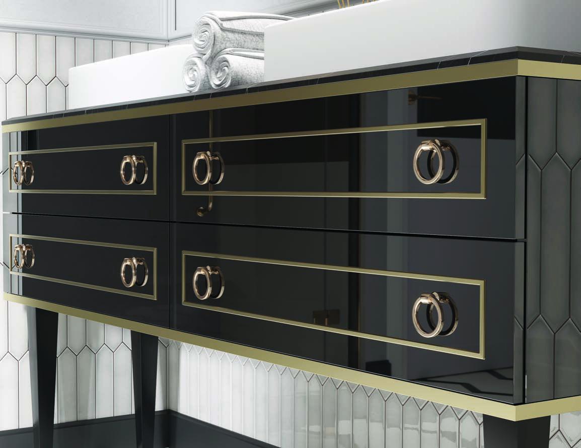 Тумба для ванной комнаты «Сиара» предназначена для просторных помещений и поможет создать комфортный интерьер с элементами стиля прованс. Напольная тумба на высоких опорах выполнена в темном оттенке, фасады декорированы оригинальной фрезеровкой, кромкой и дизайнерскими ручками в цвете «золото». Модель предусматривает не только установку раковины, но и хранение под рукой всех необходимых хозяйственных мелочей, бытовой химии и уходовых средств во вместительных ящиках.